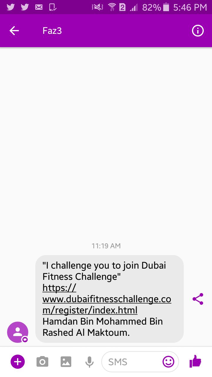 The message reads: “I challenge you to join the Dubai Fitness Challenge,” and was signed off by ‘Hamdan bin Mohammed bin Rashid Al Maktoum’.