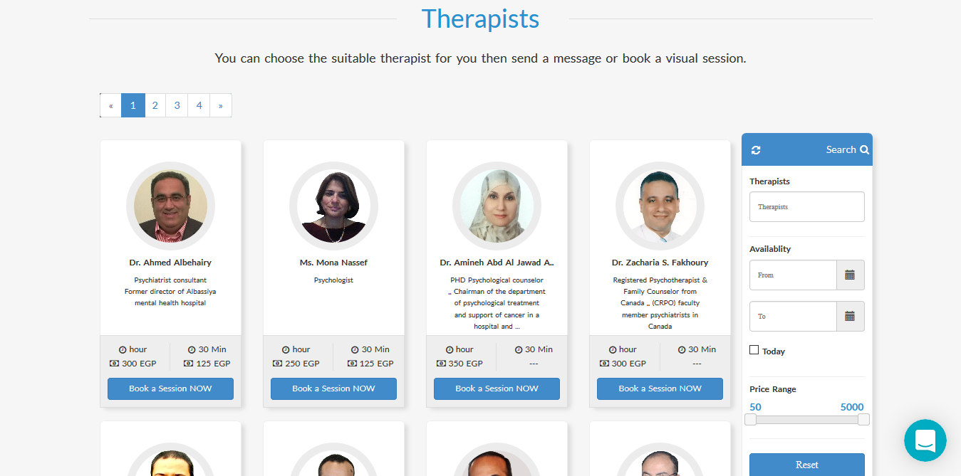 The choices of therapist, however, was my favorite part. You’re offered a huge list of psychiatrists and therapists from all over the world that you could book with. Each has their specialty, rates per 30 minutes, and their free booking slots. The prices range from 50 LE per 30 minutes to 2000 LE. There’s also a filtering search option so you don’t have to go through all of them to pick your therapist. The only thing I would’ve loved to see is a specialty filter option. It would have made the picking much easier.