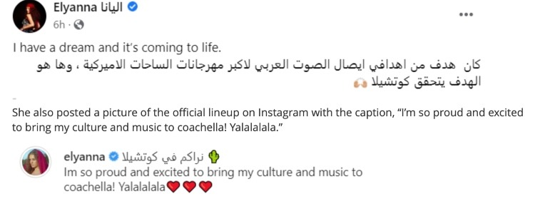 In an interview with Cosmopolitan, Elyanna was asked about where she sees her music career in five years’ time? The artist replied that she hopes that she’ll be in a place where she can actually succeed in her mission to leave a mark, not only in the Arabic world but internationally because her music has such a unique sound that she wants to share with the world. Well, her mission is about to come true as she prepares to represent her culture at the most popular music festival in the world.