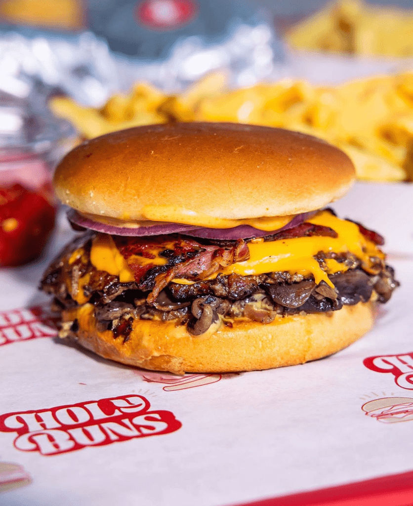 Angus smashed burgers, crunchy fried chicken, hot dogs, and the iconic Lacy Burger — Holy Buns doesn’t play. Think ultra-fresh ingredients, mushrooms that actually taste like mushrooms, and buns that don’t fall apart mid-bite.