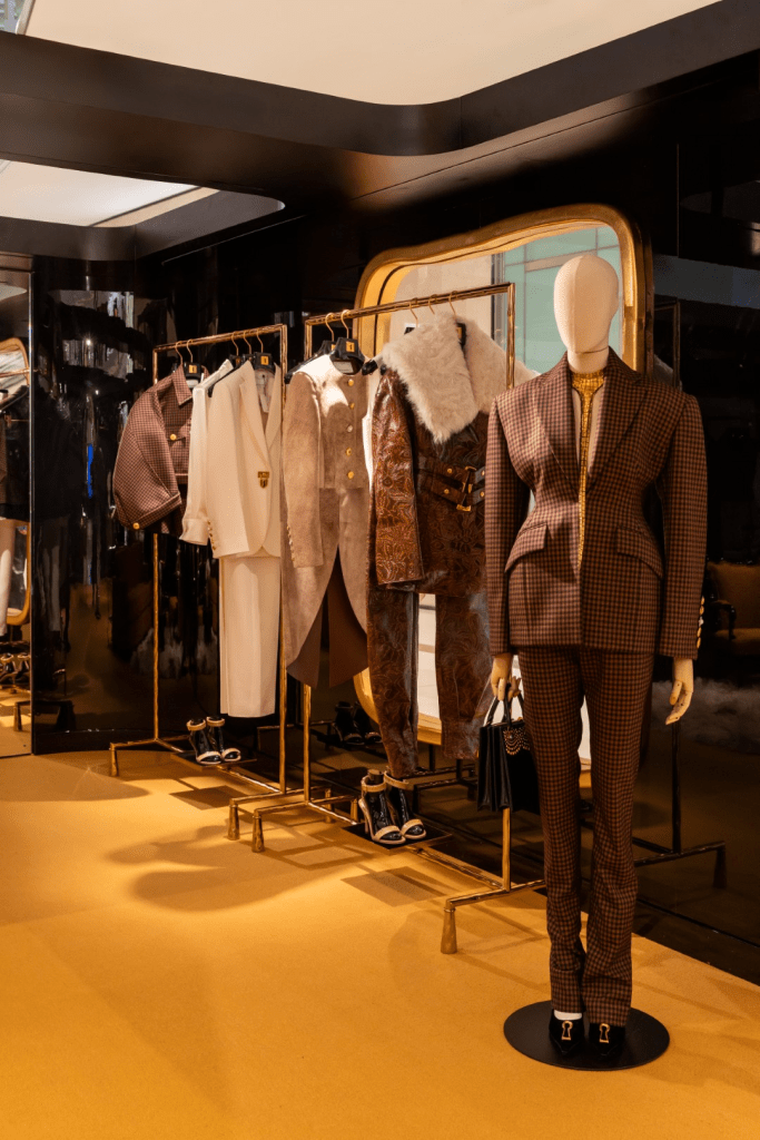 Inside, it’s all about the Maison’s Fall–Winter 2025 collection. Think trompe-l’œil knits, sculptural denim, cocktail dresses, sharply tailored coats, and, of course, the iconic Face and Secret bags with their anatomical gold details. Jewelry, leather accessories, and other playful trinkets are displayed like works of art, turning shopping into an immersive experience.