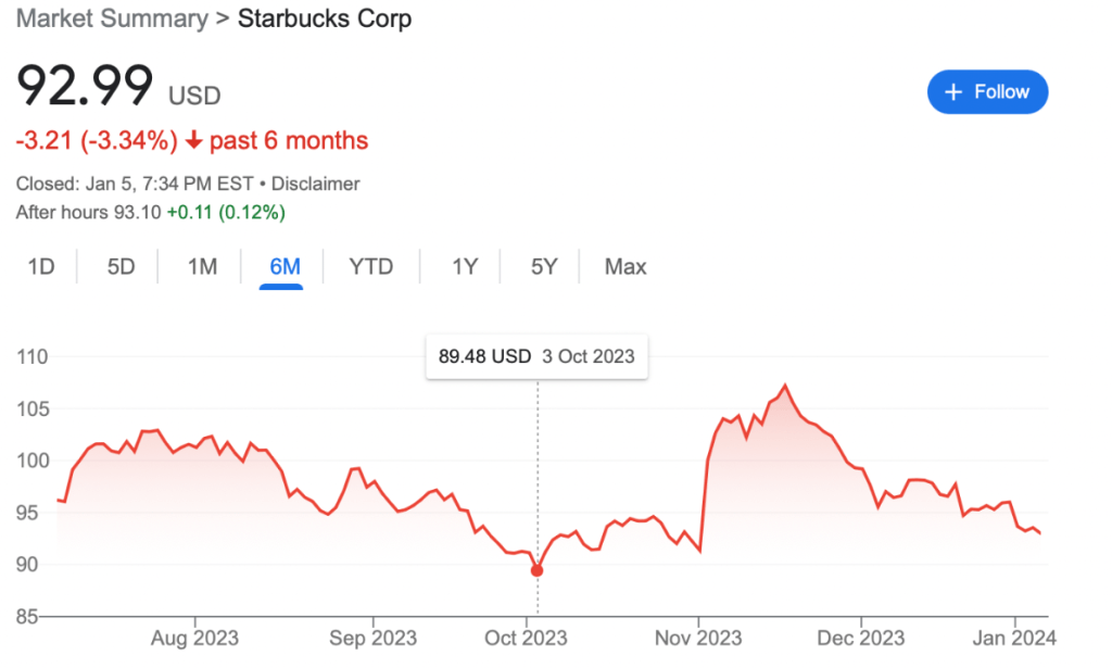 Similarly, Starbucks faced a major decrease in stock prices, especially in October, with its lowest stock price being $89.48. Stock prices did rise again for Starbucks during November, with the highest price being $107.21 during day 40 of the genocide, but dropped once again during December and January.