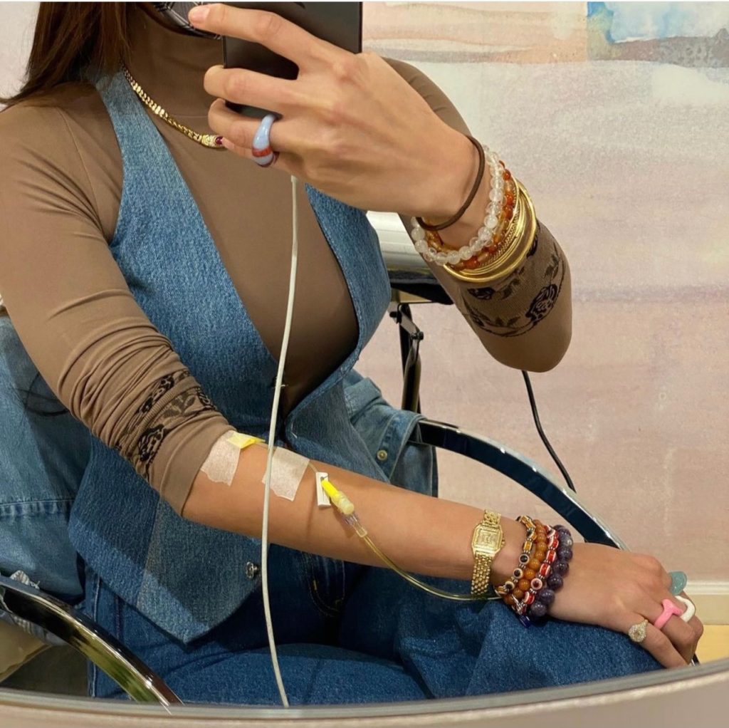 Bella Hadid courageously shared some photos on Instagram of herself during an IV session.“Living with a few chronic autoimmune diseases = always finding time for my IVs,” she said.