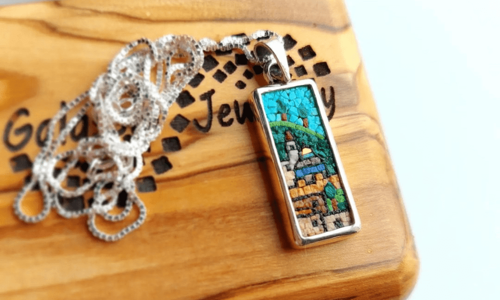 Bringing something new to the jewelry game is Bethlehem-based Galassia jewelry, a Palestinian brand that handcrafts necklaces, earrings and bracelets using delicate mosaic and silver. Each piece of jewelry is akin to a work of art, bursting with color and unique illustrations. In support of Palestine, the brand crafted several pieces devoted to celebrating the country and its culture. Their pieces include ombre-hued Palestine map earrings, micro mosaic watermelon necklaces and a necklace shaped as a rectangle mosaic illustration of old Jerusalem.