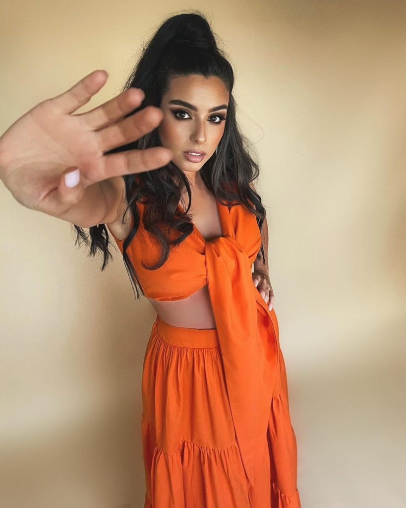 She doesn’t stop playing with new fashion pieces, just for the hell of it. Looking like a bohemian princess in orange, long hair extensions, and a smokey eye, she posted this picture with the caption, “Experimenting.”