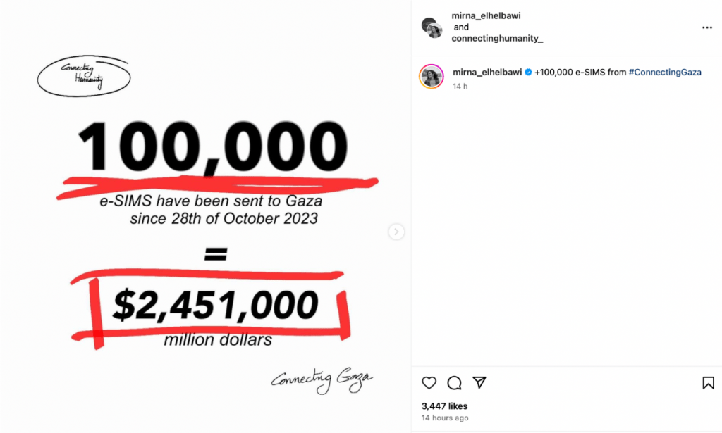 Since October 7, and amid the Israeli airstrikes and Gaza genocide, the entire strip has been cut off from telecommunications four times. That’s where Connecting Gaza comes into play, an initiative spearheaded by Egyptian author and activist Mirna El Helbawi that aims to offer e-SIMs to Gazans. So far, they’ve been able to send 100,000 e-SIMs to Gaza.