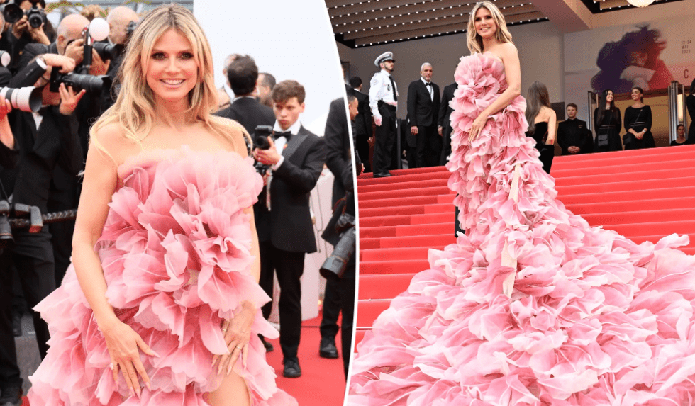 Heidi Klum made two bold Elie Saab statements at Cannes this year from the same collection, but each had a very different vibe. First, she wowed in a dreamy blush pink organza gown covered in rose-like swirls and a dramatic train—so dramatic, in fact, it quietly defied the festival’s new dress code rules.
