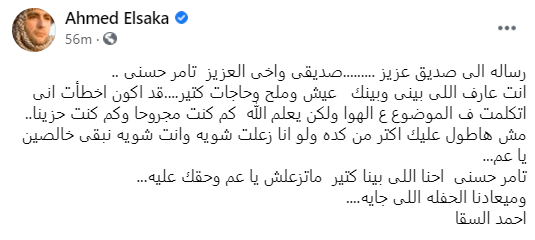 Ahmed El Saka wrote on Facebook that he apologizes for the misunderstanding and that he only said that because he was immensely hurt by it. He also said that what they have in common is much more than work and that their friendship shouldn’t be compromised for anything. He ended the post saying that he can’t wait for Tamer’s next concert and that he’ll see him there.