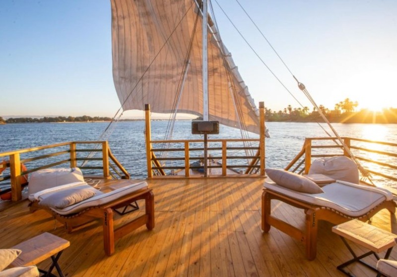 Nebyt is one of the most luxurious dahabeyas you’ll ever come across. With its shaded sundeck and hot tub, it’s designed to make you enjoy the calmness and tranquility of cruising by the Nile, while getting to visit unique historical sites between Luxor and Aswan. and chaise lounges. The starting price, per person, for a double room for 6 days is $1140.