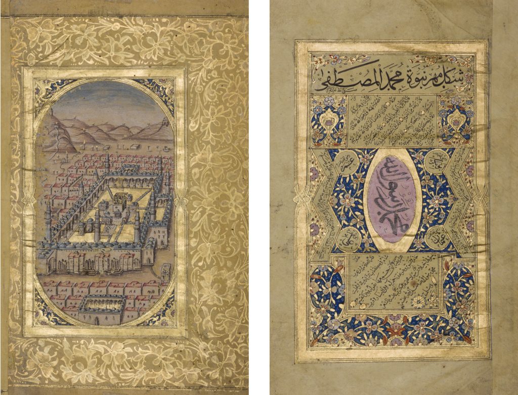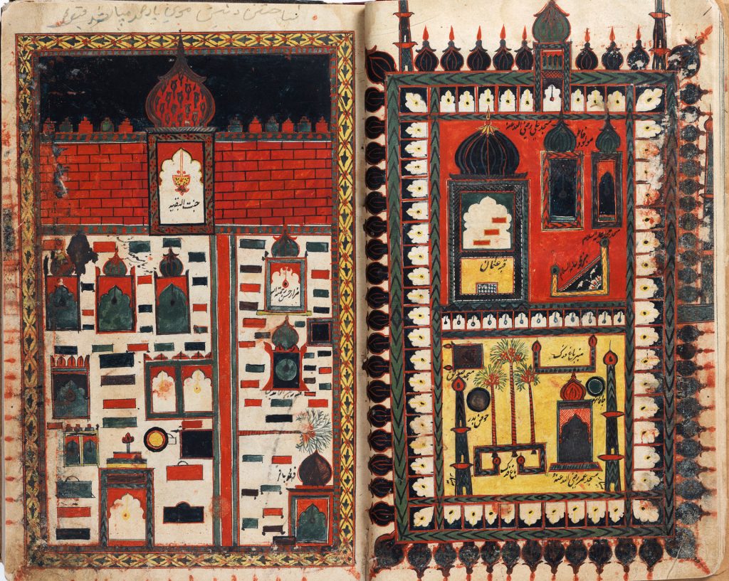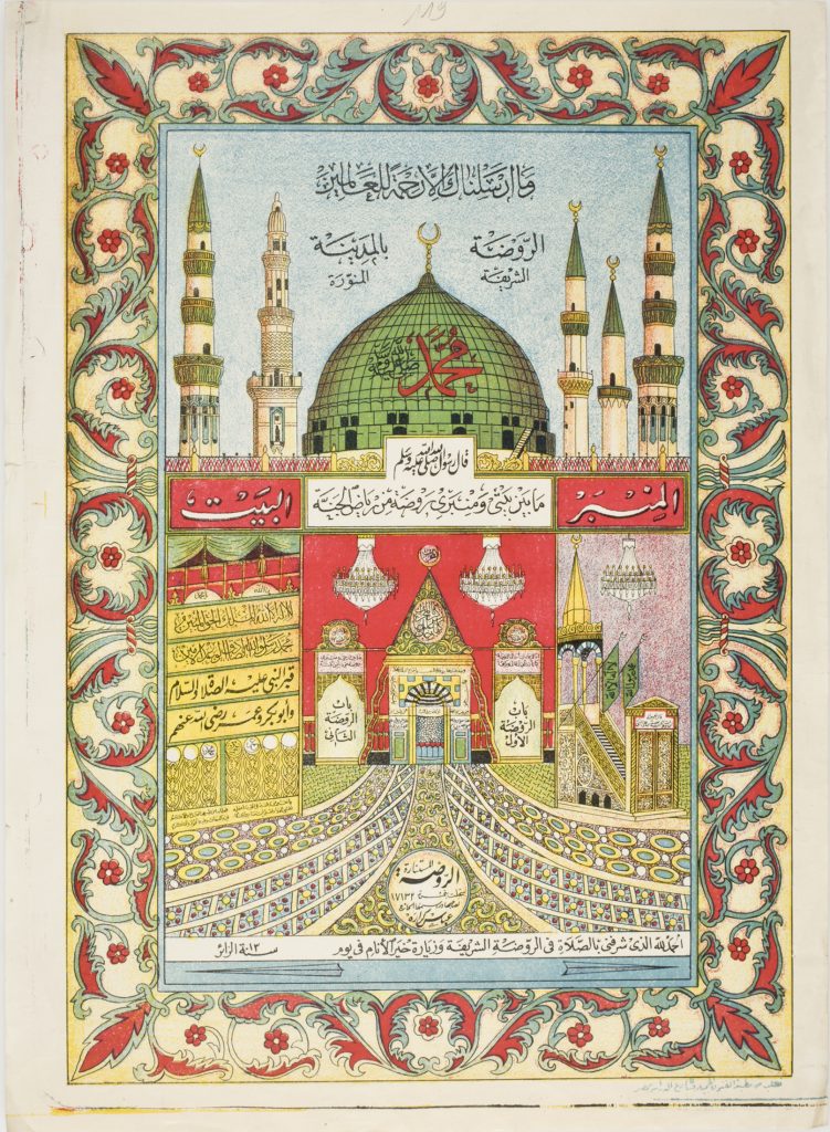 Indian-made depiction of the Prophet’s tomb along with other important locations in the two holy cities from the early 19th century