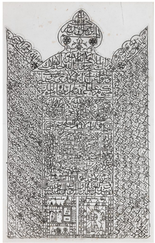 Turkish-made hilyah of the Prophet Muhammad featuring depictions of Mecca and Medina in the bottom centre from the 19th century