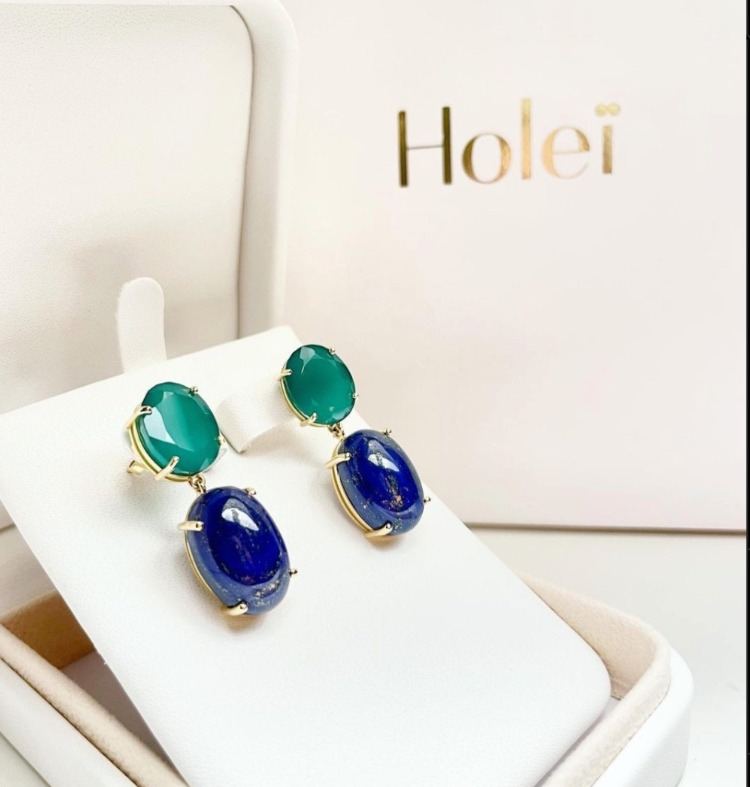 Launched back in 2021, this up-and-coming jewelry brand was founded by jewelry designer Lien Sulaiman. Based in Dubai, Holei is known for exquisite designs that carry their own stories. Their creation “Melos” refers to a beautiful island in Greece, where the inspiration of these earrings came from celebrate the beauty of the island. The earrings are designed using Jade and Lapiz Lazuli gemstones which are believed to release stress and bring deep peace along with increasing creativity.
