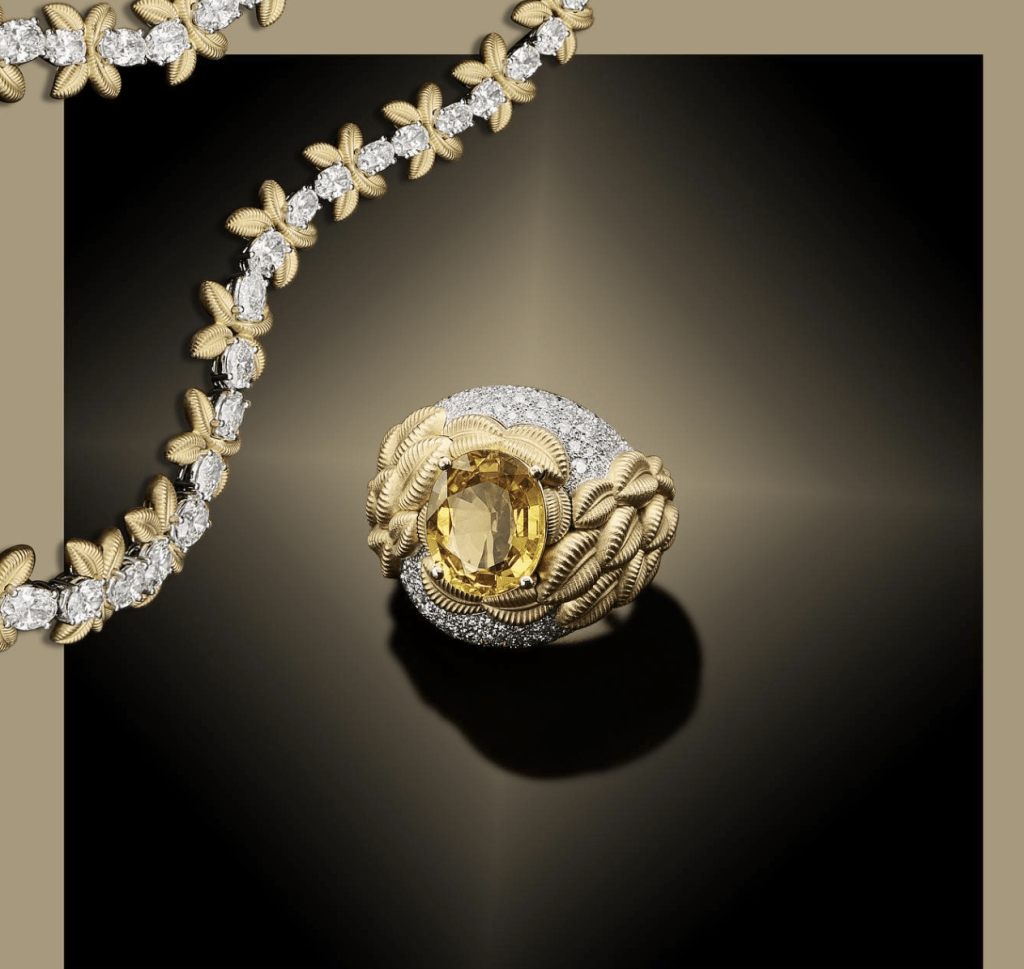 Based in Jeddah and Genève, Nadine Jewelry‘s designs are inspired by nature, spirituality and culture. With the use of Canary Apatite gemstone, the brand was able to create the “Canaria set” which symbolizes delicacy and sweetness. The design is inspired by the canary specie with its gold feather detail in each piece. According to gemstone experts, the Canary Apatite is a stone of dual-action, bestowing strength for the pursuit of personal qualities and achievement of collective goals.