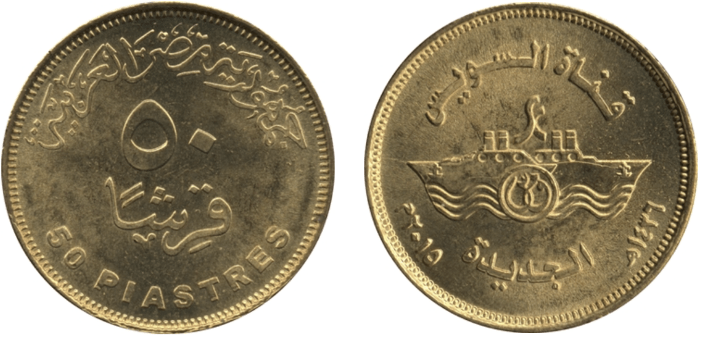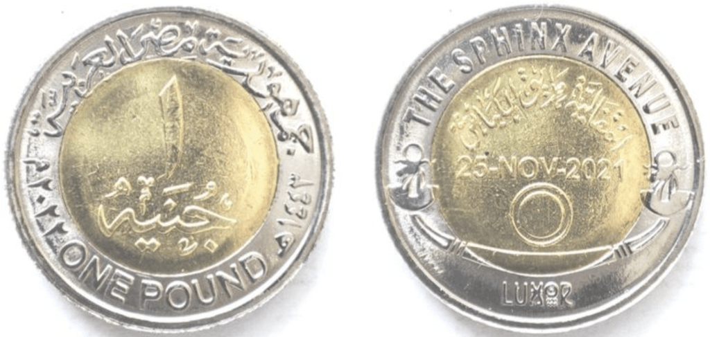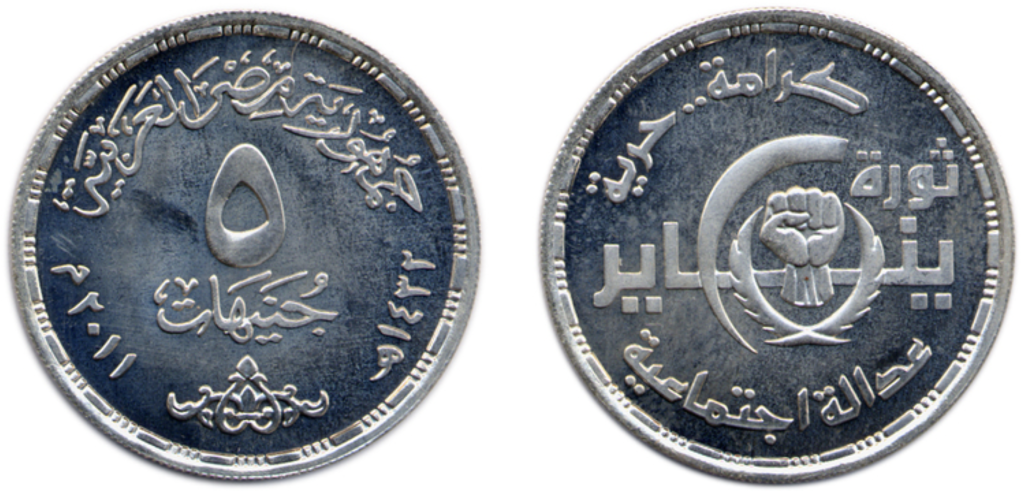 To mark the Egyptian Revolution of 2011 that overthrew President Hosni Mubarak, the Central Bank of Egypt issued a commemorative coin to mark the event. Written on the coin is ‘dignity, freedom, social justice’, three key demands of the revolution.