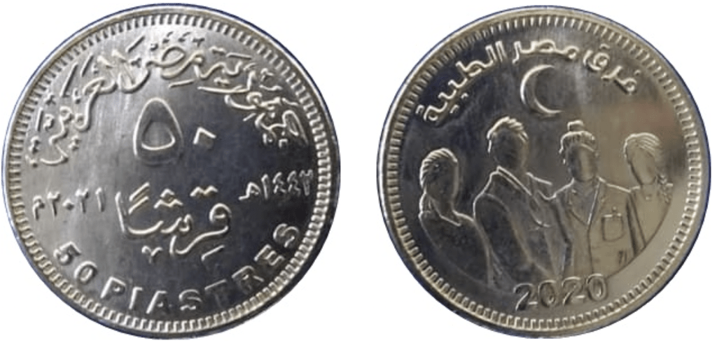 During the COVID-19 pandemic, medical teams and hospital staff faced gruelingly long shifts and increased danger, which often left them separated from their families for weeks at an end. Many doctors, nurses, and support staff also sadly died of COVID-19, having caught it while trying to help others. In commemoration of their brave and hard work, the Central Bank of Egypt issued this coin to thank them.