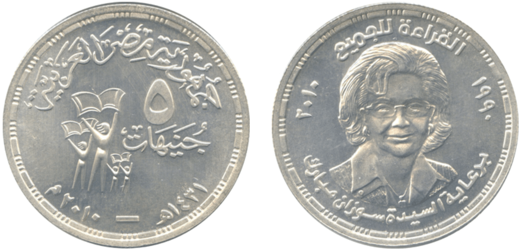 The wife of former Egyptian President Hosni Mubarak, Suzanne Mubarak, was well-known for her work with children and promoting literacy, which this coin commemorates. To my understanding, this was the first time a living political figure or spouse had been featured on an Egyptian coin.