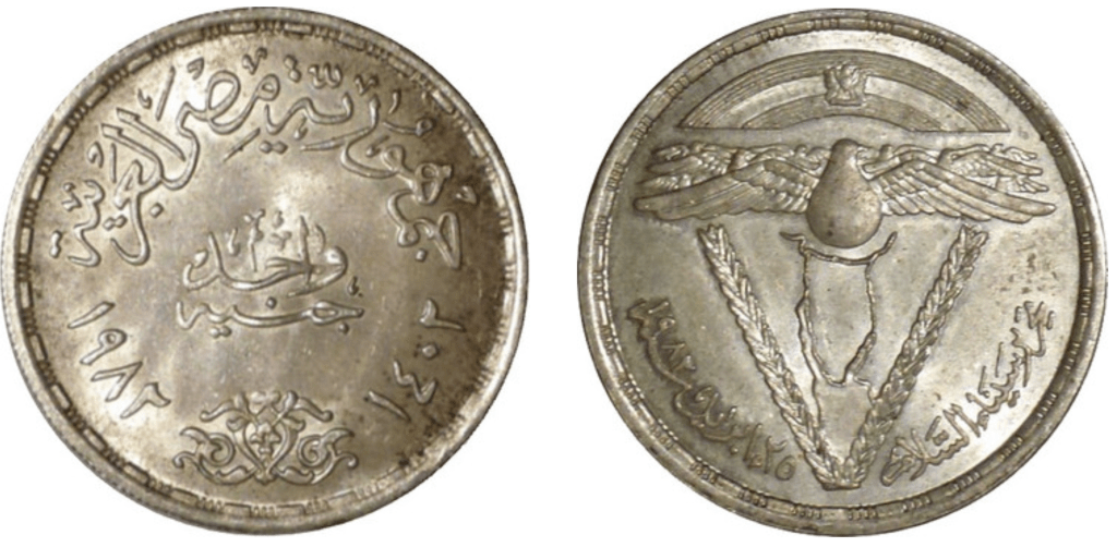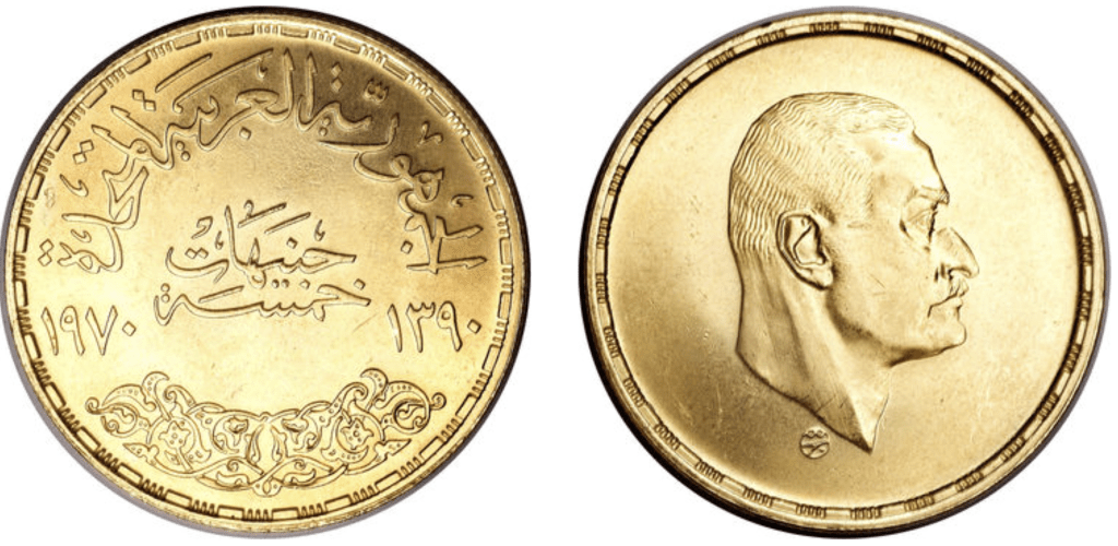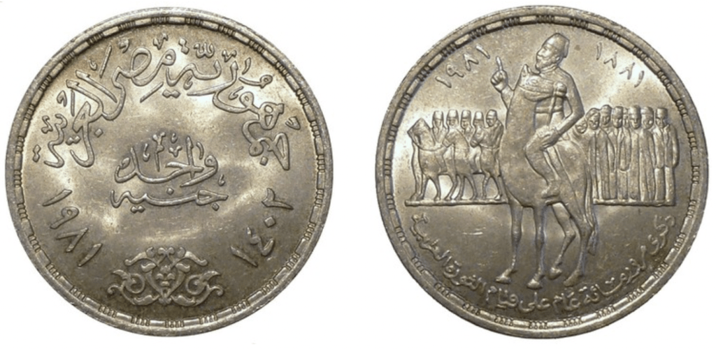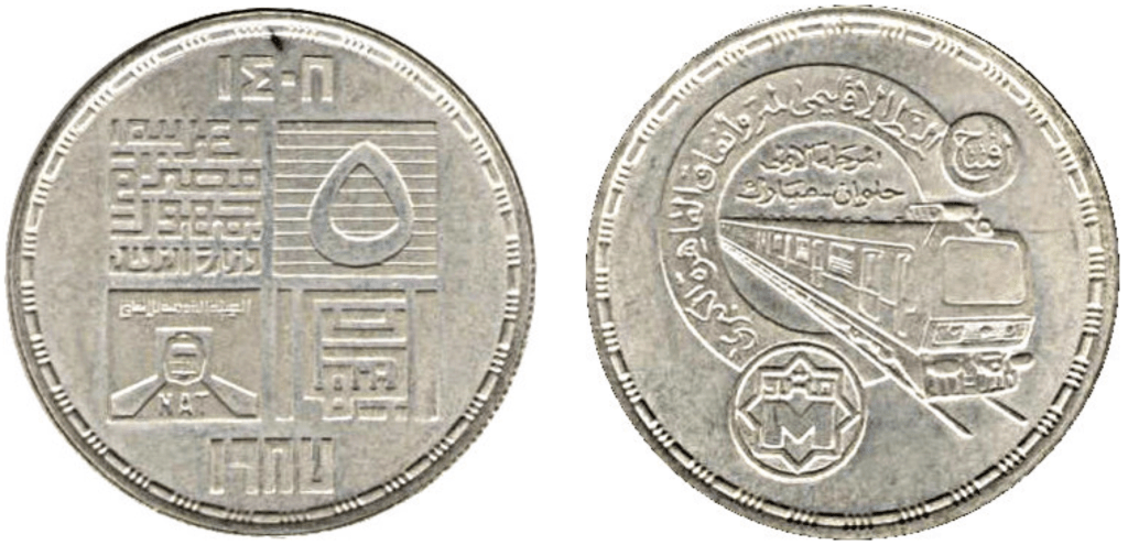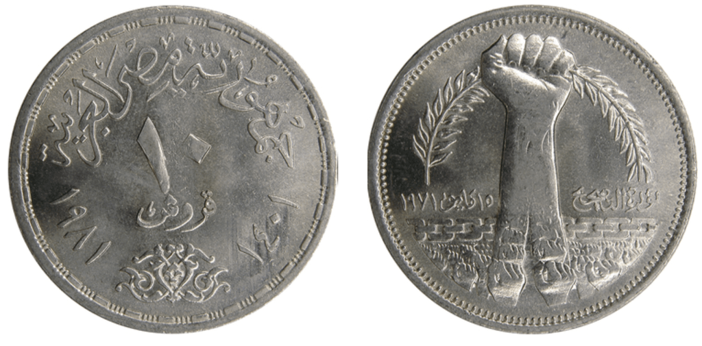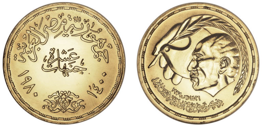 In 1979, President Sadat signed a controversial peace treaty with Israel. While this event is often not spoken about or memorialized by the organs of the state, in 1980 the Central Bank of Egypt issued this commemorative coin.