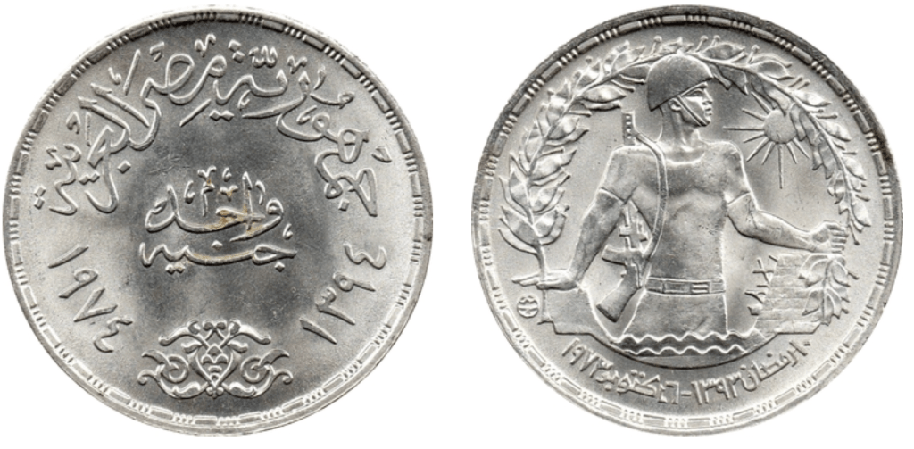 Even just a year after the 1973 October War, commemorative coins were being minted to celebrate the recapturing of parts of the Sinai and victory over Israeli forces. This coin become the first of many that would commemorate this victory and memorialize its martyrs.