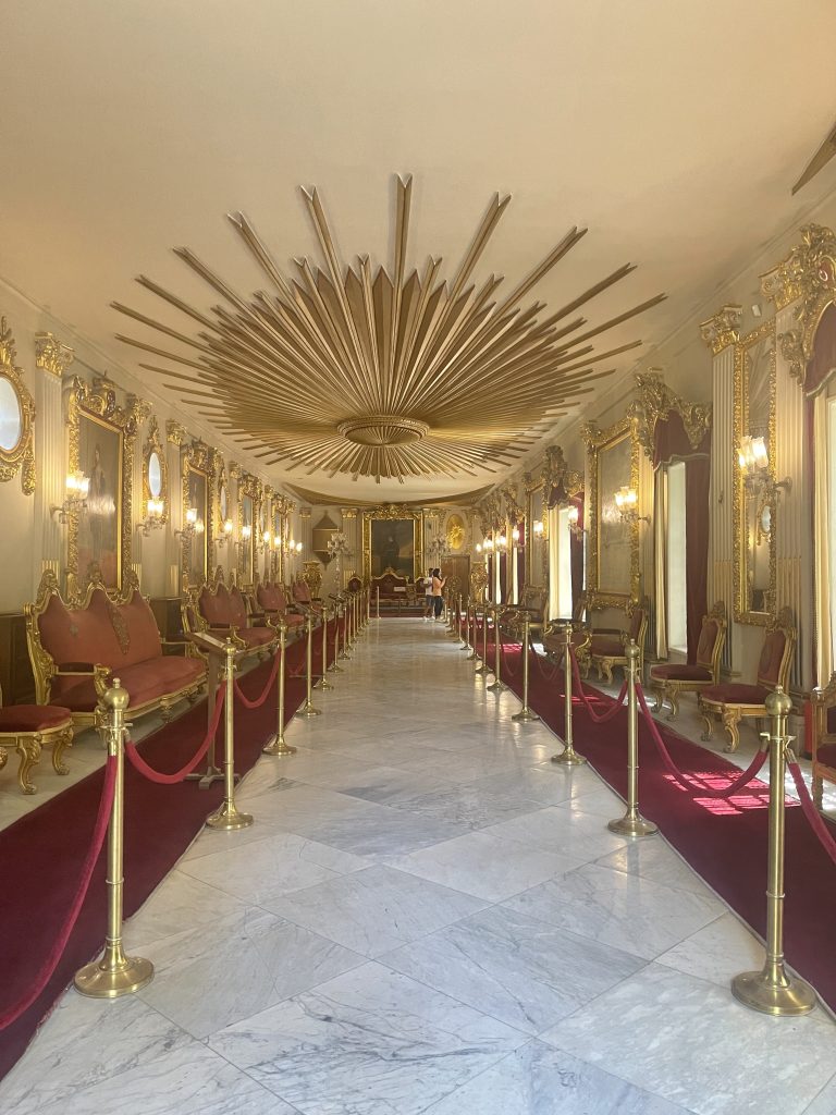 The throne saray is distinguished by its royal characteristics and the beauty of its inscriptions and decorations. It is where Prince Mohamed Ali used to receive his guests during occasions and holidays. The ceiling is covered with sun disk, golden rays and it contains luxurious maroon red furniture consisting of gilded sofas and chairs adorned with large paintings of Egyptian rulers. The residence saray is the main palace, and one of the first buildings that was built. It was the residence of the prince, and consists of two floors, and the first floor includes several rooms, including the harem room (a room for the ladies), the mirror room, and the blue salon room. The second floor includes the prince’s bedroom and bathroom.