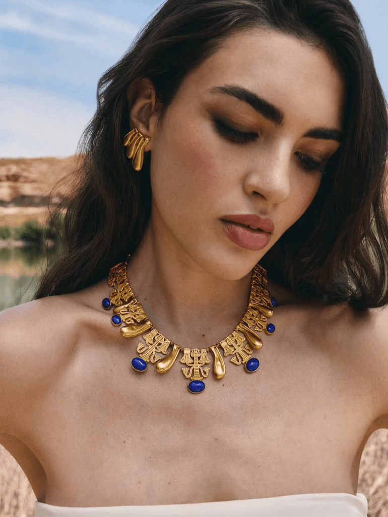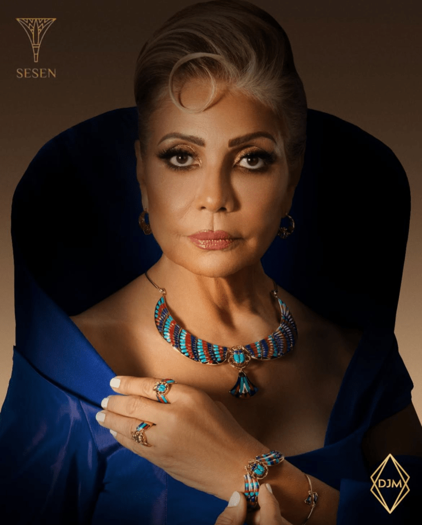 DJM’s collection SESEN, featuring Sawsan Badr, blends modern style with ancient Egyptian flair. Inspired by the GEM’s opening, the line includes dramatic, statement-making pieces that feel like they could have belonged in a pharaoh’s treasure chest—but are designed for today’s fashion lovers.