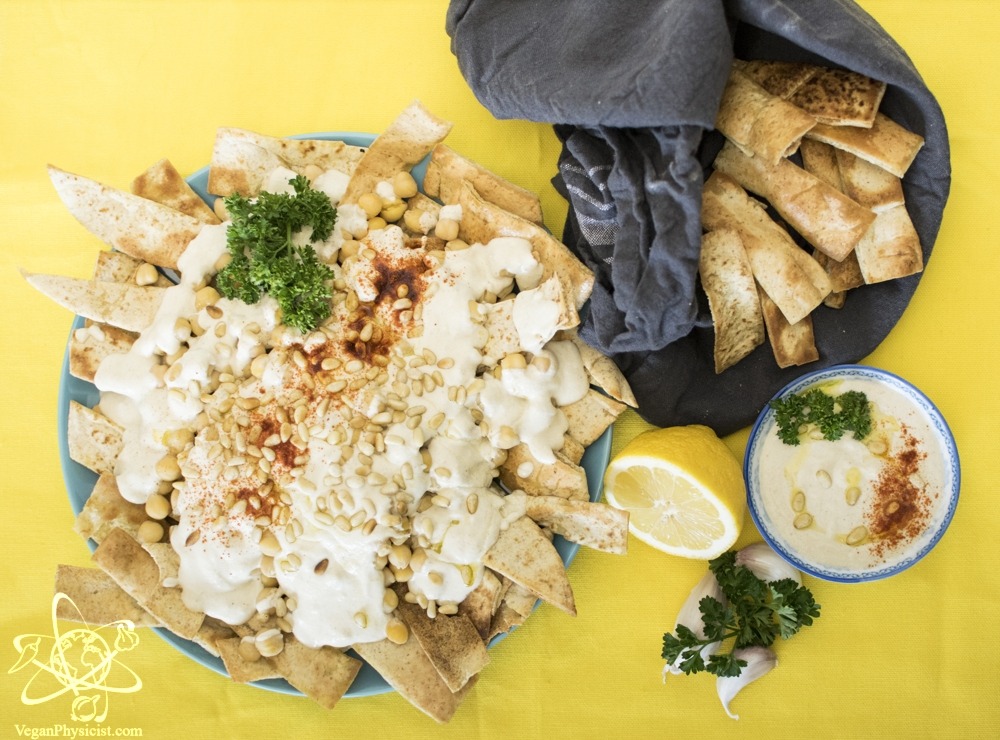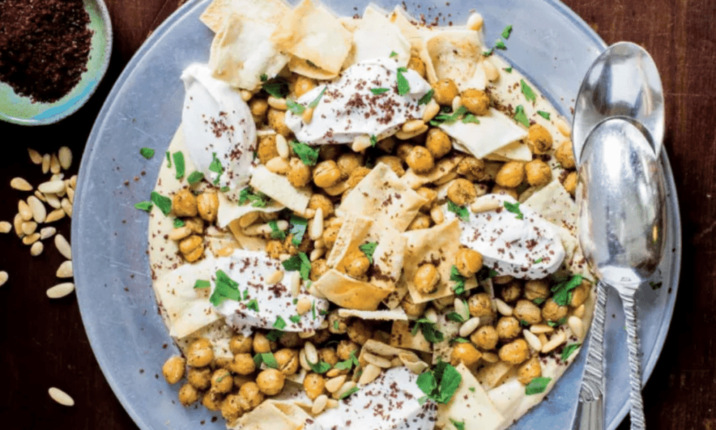 - Break up the toasted pita wedges a bit and arrange them in an even layer on the bottom of a deep serving platter, bowl, or casserole dish. Top with the warm chickpeas, then the yogurt sauce. Sprinkle with pine nuts and parsley or cilantro and serve with additional pita or pita chips.