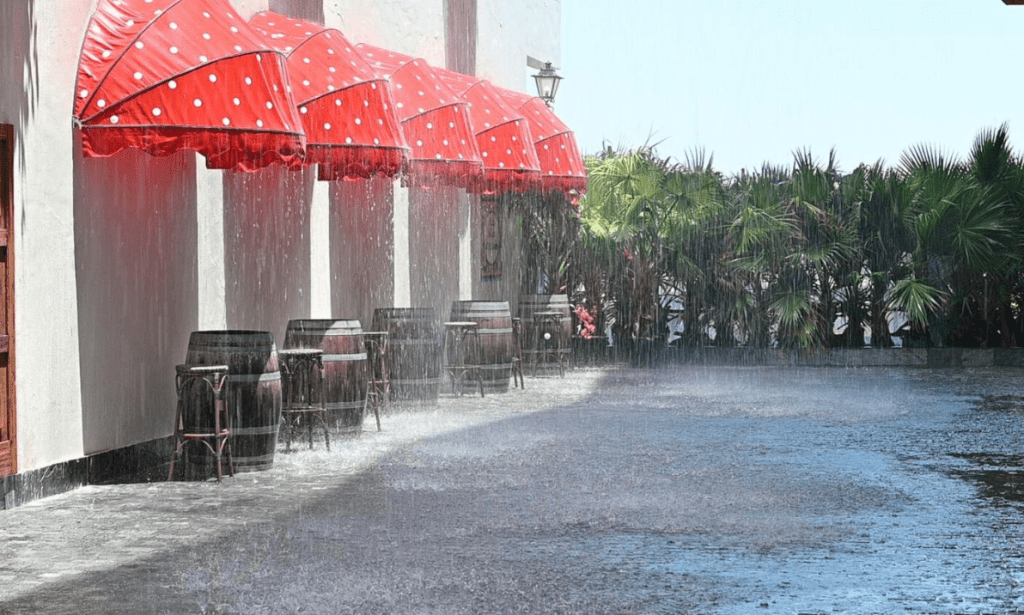 On that street is a restaurant called La Brasserie, with both outdoor and indoor seating. Many who sit outside watch the rain drip down from the awnings above them. Diners can dine while watching the rain come to life in a desert city that knows how to make miracles happen.