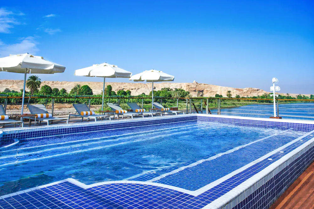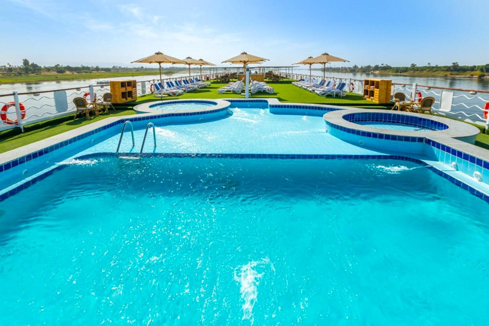 Alexander the Great Nile Cruise offers four-night Nile River cruises from Luxor every Monday and four-night Nile cruises from Aswan every Friday. The cruise offers a complimentary airport transfer service and an outside pool surrounded by cozy lounge chairs where you can chill and enjoy the sunset. They provide spa services including a hot springs bath and different massage therapies. Their prices start at EGP4000 per night.