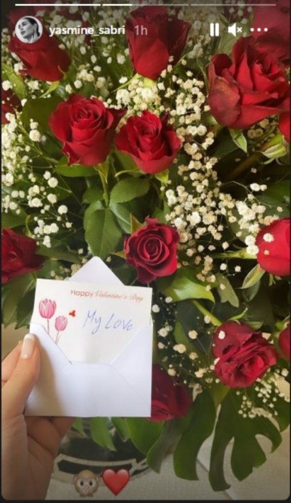 Yasmine received a bouquet of flowers from her husband, Abou Hashima, for Valentine’s Day and posted a picture of it in her Instagram story, thanking him. Why hasn’t anyone sent me flowers?