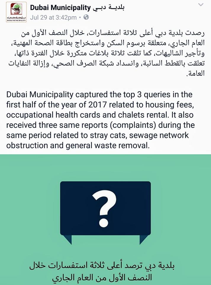 Consider, for example, the fact that Dubai Municipality has for a long time now opened its doors to citizen’s complaints, and has attempted to respond to shared/popular complains. Since January 2017 alone, the municipality’s toll-free number received over 400,00 calls. This averages to approximately 2,200 queries and complaints a day.