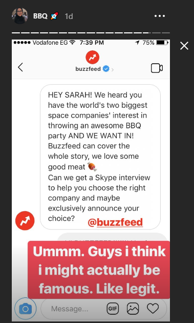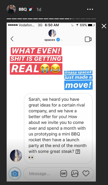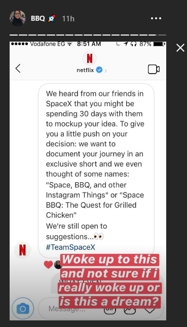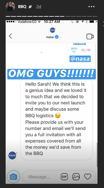 Sarah Abouelkhair was chilling, having fun and created a series of funny Instagram stories to propose a “genius” idea for NASA. The idea was to put a giant BBQ under the rockets they send out in space and use the heat of the rockets to grill the chicken and the meat; creating a huge BBQ party after every rocket that goes off into space.