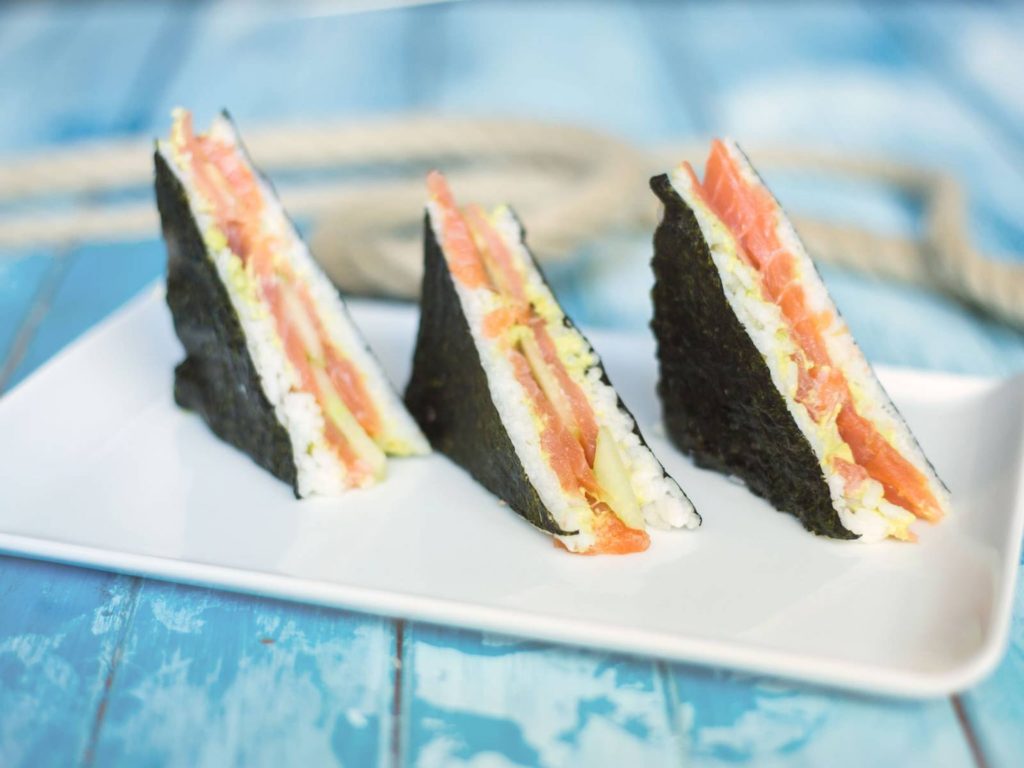 Place one nori sheet on cutting board. Layer it with rice, the avocado cream that you just created, salmon, cucumber, more salmon, avocado cream, and rice. Place another nori sheet on top. Lightly press down to ensure that all of the ingredients stay in place. Cut into triangle-shaped sandwiches.