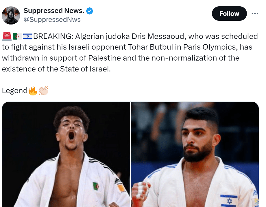 Algeria’s judo federation has not issued a public statement so far, and Messaoud has also remained silent on that matter.