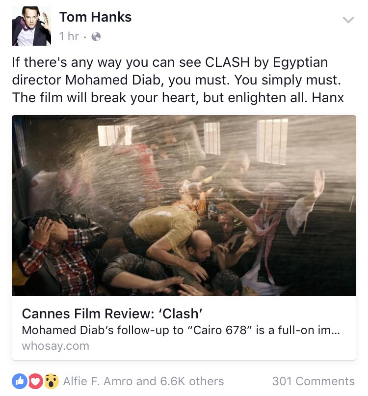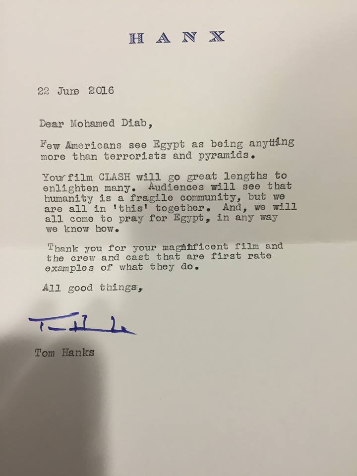 A few days ago Egyptian Director Mohamed Diab posted a photo of a letter he received from the one and only Tom Hanks congratulating him on the movie Clash.