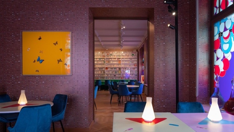 Damien Hirst’s Pharmacy was first displayed in 1992 at the Cohen Gallery in New York. In 1998, the artist opened a functional restaurant version of the piece in Notting Hill, London, for which Miuccia Prada created the staff outfits according to Vogue.