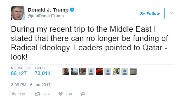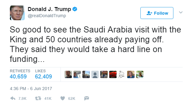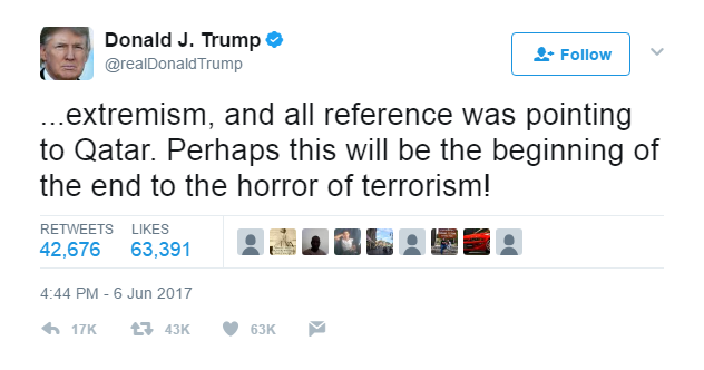 Last Tuesday, he tweeted that he reached an understanding with Middle Eastern leaders regarding the financial source behind terrorism — Qatar.