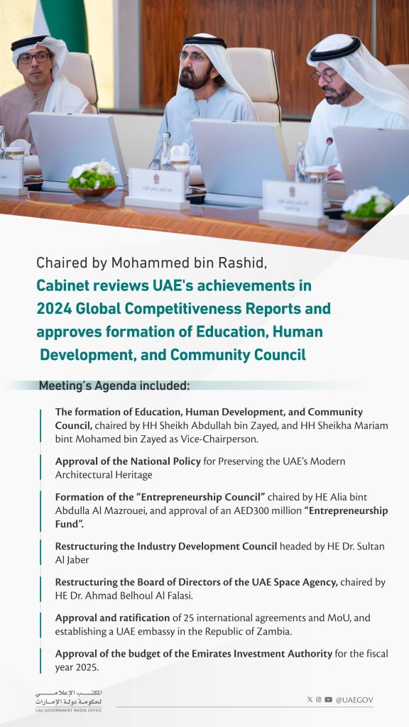 Sheikh Mohammed concluded the Cabinet meeting by reflecting on the UAE’s achievements in 2024, a year marked by economic growth and global competitiveness. The UAE ranked first globally in 223 development indicators and placed in the top five for 444 indices related to business, technology, infrastructure, and tourism.