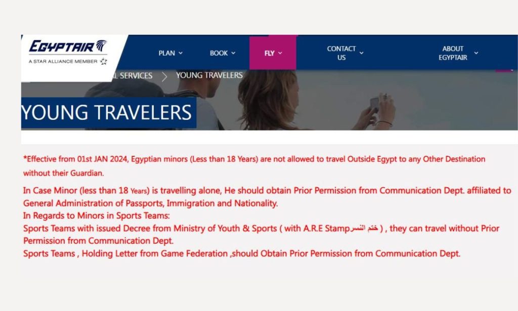 However, according to Egypt Air’s statement on their official website, sports teams with issued Decree from Ministry of Youth & Sports that has the ‘Eagle’ stamp can travel without such permission from the Administration of Passports. Children with Visual/hearing impaired (blind/deaf) unaccompanied minors are not accepted for unaccompanied travel.