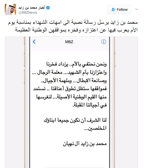 Sheikh Mohammed wrote a poem dedicated to the mothers whose sons died serving the country. “Rejoice oh mothers of martyrs, for you have found in [Sheikh] Mohammed and myself a family,” His Highness said.