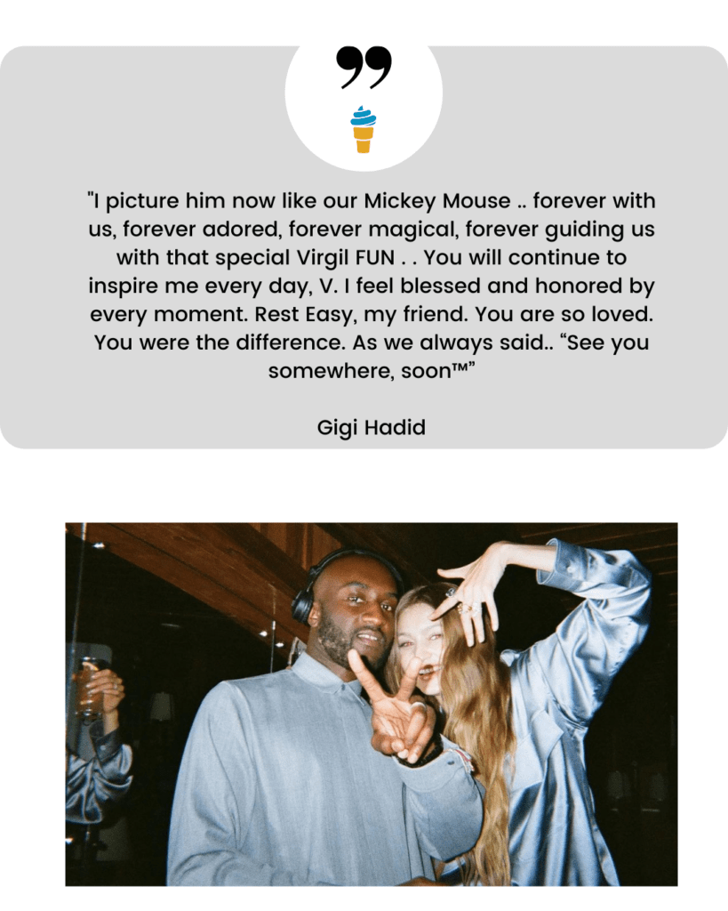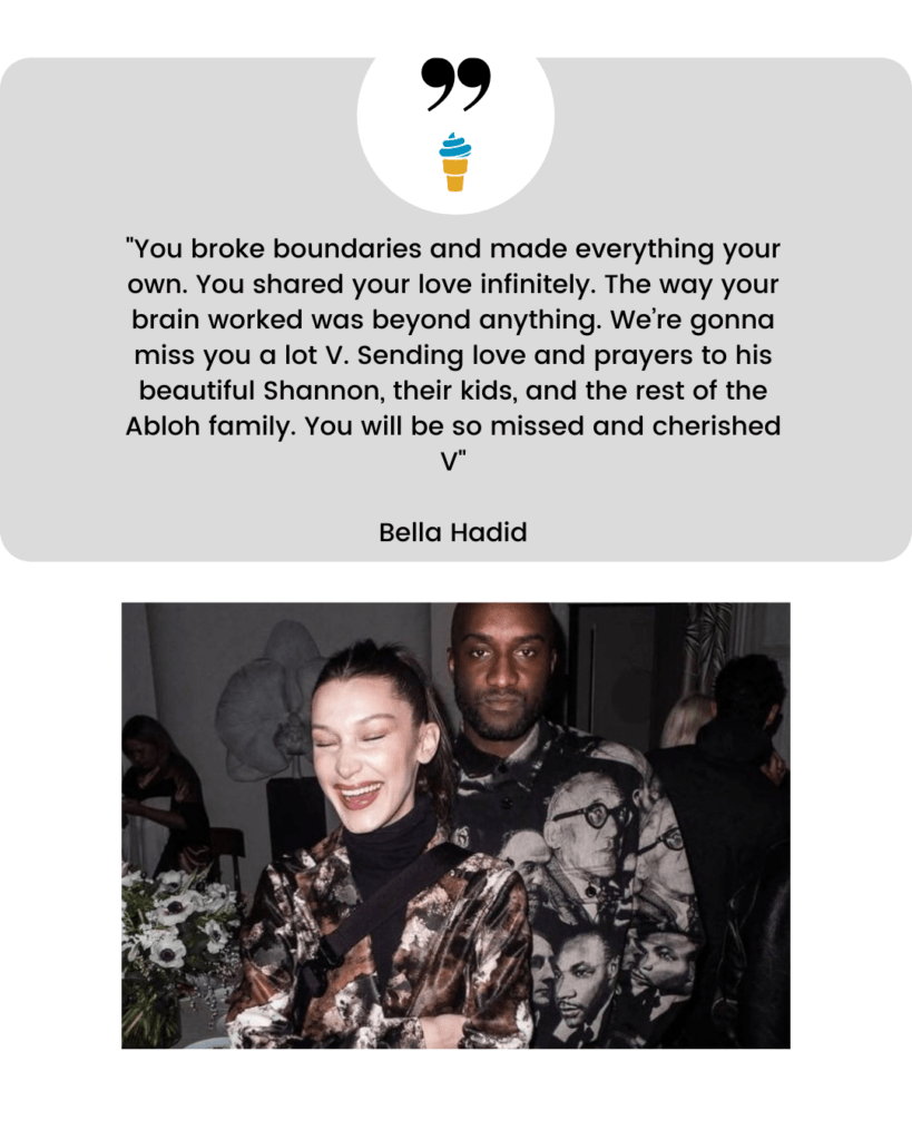Gigi Hadid, Bella Hadid’s younger sister, was devastated by the news of Abloh’s death and wrote the following: