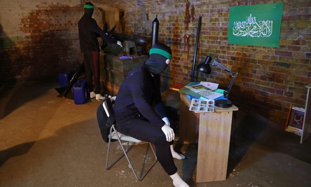Artists have created installations that ‘allegedly’ bring to life the reality of Hamas tunnels, where the Palestinian group operates and hides hostages. They feature masked Hamas members, a foreboding claustrophobic atmosphere, and bloodshed.