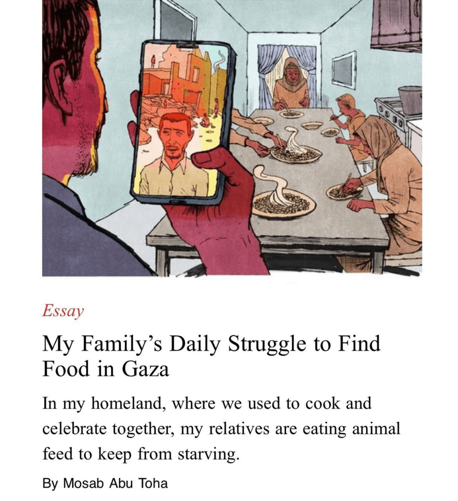 In response to the Pulitzer news, Mosab Abu Toha said he was grateful but heartbroken. “My sisters, my brothers, and my parents in Gaza are starving,” he said.