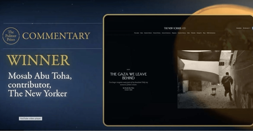 Abu Toha’s writing reminds us that literature can do more than describe suffering; it can preserve dignity, memory, and hope. His Pulitzer is not just an honor; it’s a refusal to let Gaza be forgotten.