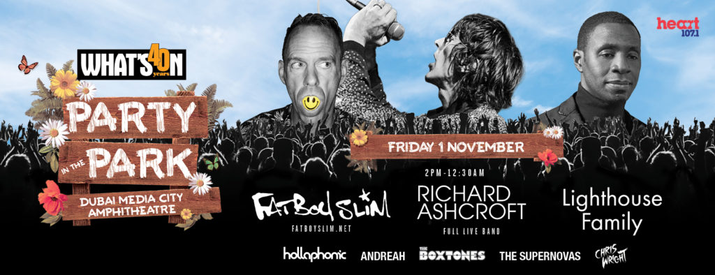 From 2 PM and until 12:30 AM, Dubai Media City Amphitheatre will host Party in the Park, a one-day music festival. The party will feature Fatboy Slim, Richard Ashcroft, and Lighthouse Family.