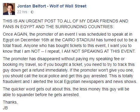 If you found his post TLDR, here is the summary of it: Jordan Belfort is warning people from the fraud event and asks everyone to turn in the promoter! We hope to be updated soon with what will happen to the people who bought the tickets.