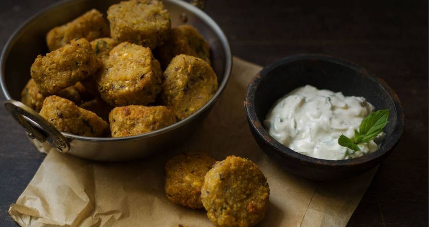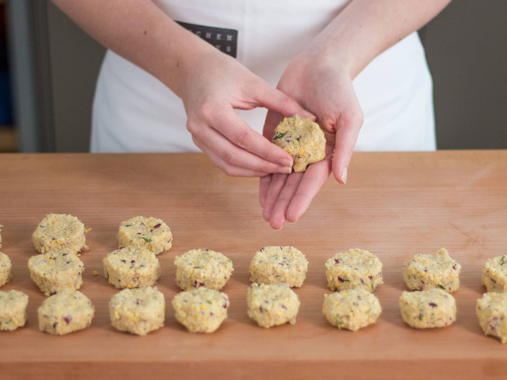 Using your hand, form small circle-like patties that basically look like falafel. Heat up vegetable oil over medium heat and fry until golden brown (4 to 6 minutes).
