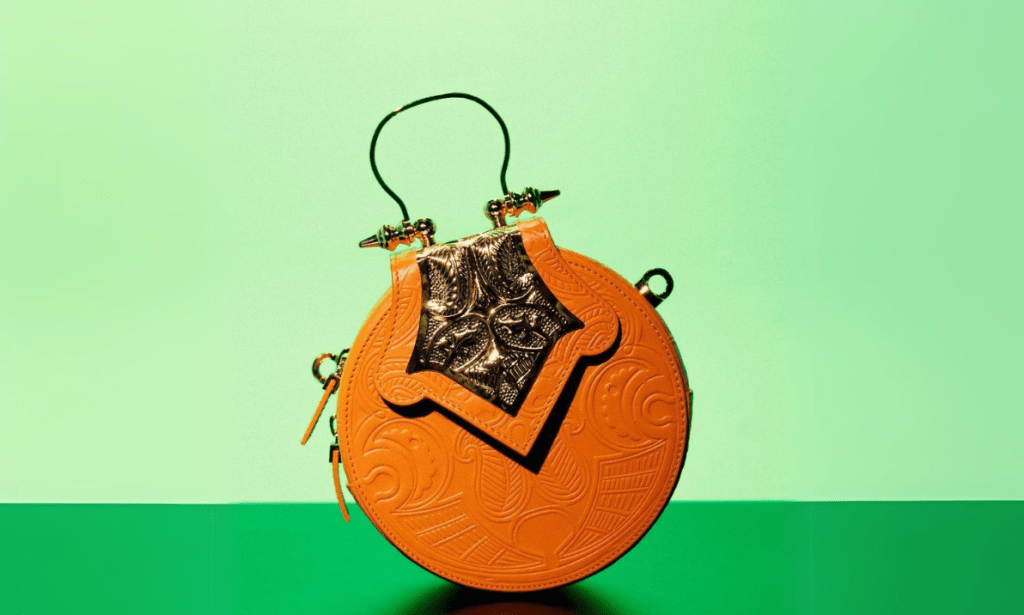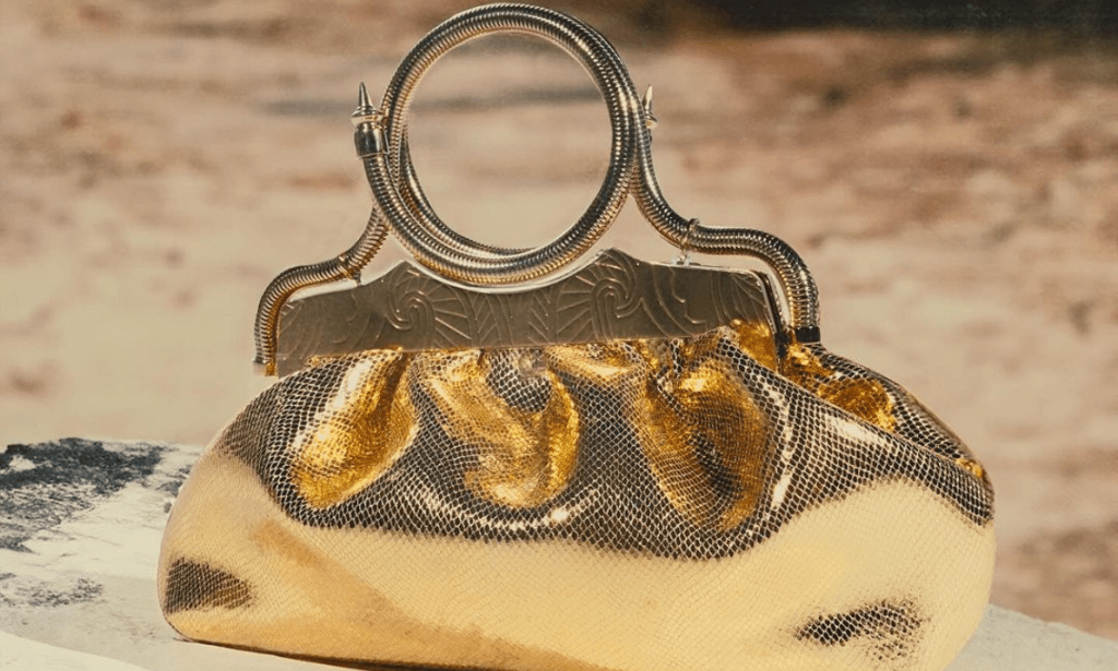 This is the famous two-sister Egyptian luxury handbag brand Okhtein. They are known for edgy, high-end handbags embellished with traditional motifs, many of which are inspired by Egyptian architecture.