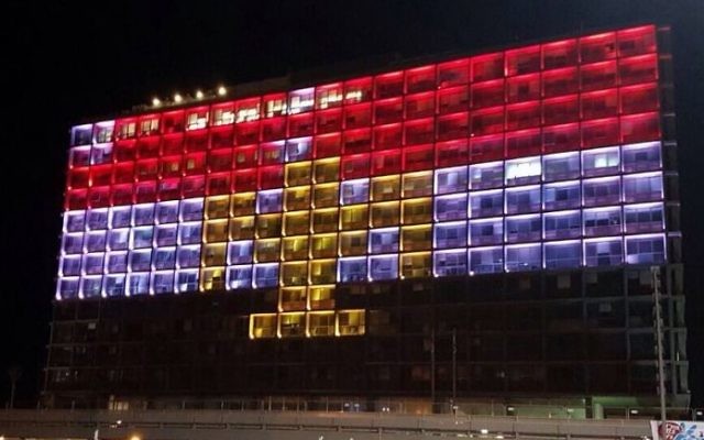 Ironically, Tel Aviv’s city hall building in Rabin Square also illuminated in solidarity with Egypt.