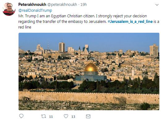 Hashtags #JersalemIsaRedLine and #JersalemIsTheCapitalOfPalestine are going viral with tweets such as the below.