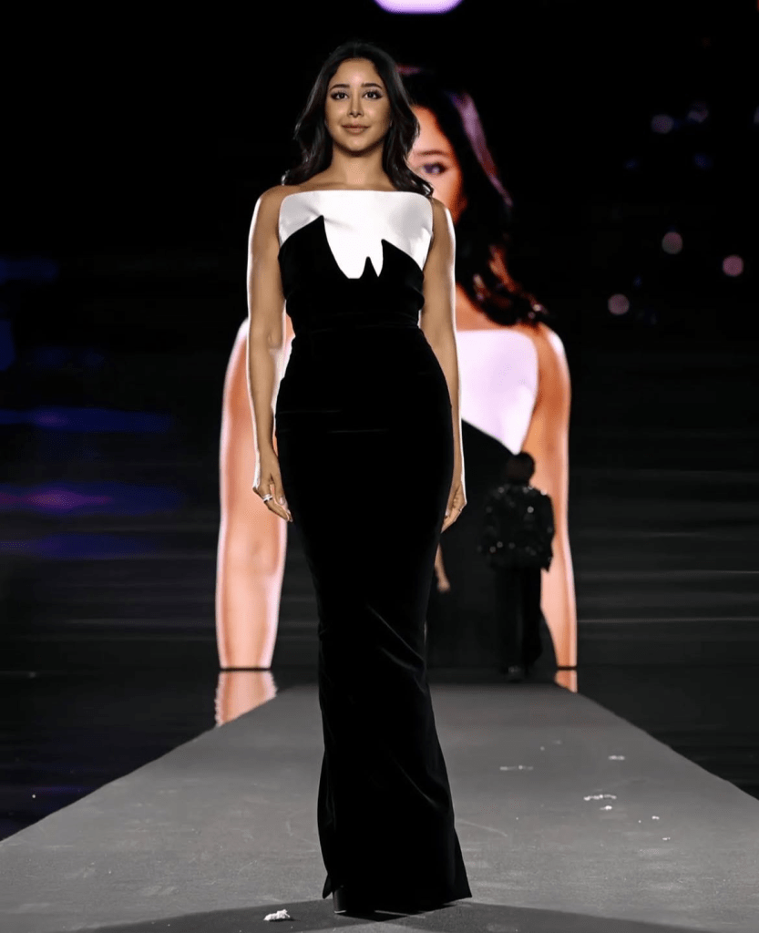 At the Miss Lebanon 2025 pageant, Nancy Ajram embraced velvet with a sharper, stage-ready edge. The black one-shoulder mini dress featured ruching and a daring slit, breaking away from velvet’s traditional formality. Under bright lights, the fabric took on a sleek intensity, paired with gold accents and a powerful stance. It was proof that velvet can be bold, youthful, and commanding, without losing its depth.