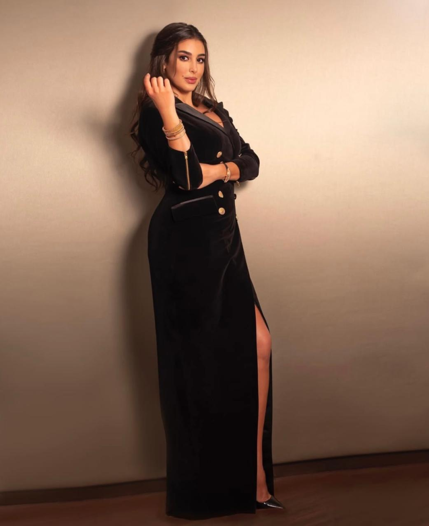 Yasmine Sabri’s velvet tuxedo dress remains a quiet reference point for how velvet can be tailored, not just draped. Designed by Lebanese designer Antoine Kareh, the black velvet piece merges menswear structure with feminine ease: sharp lapels, gold buttons, and a thigh-high slit that disrupts the formality just enough.